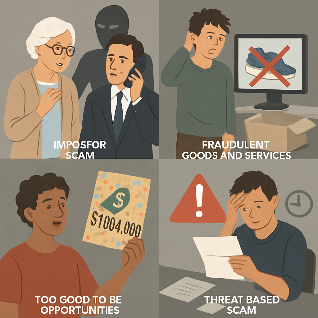 1. Impostor scams – Someone pretends to be a trusted person or organization (for example, a well-known company, a government agency, or a family member or friend).